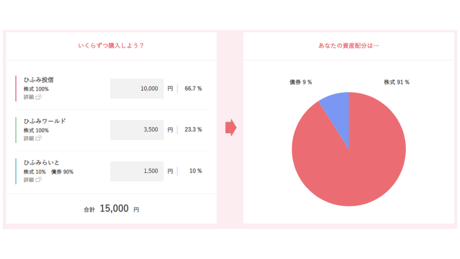 - 複数のファンドの組み合わせで守りながらふやす運用します。ひふみ投信、ひふみワールド、ひふみらいとの共同運用です。数字は株式の比率を表しております。株式比率15%(国内9%海外6%)です。