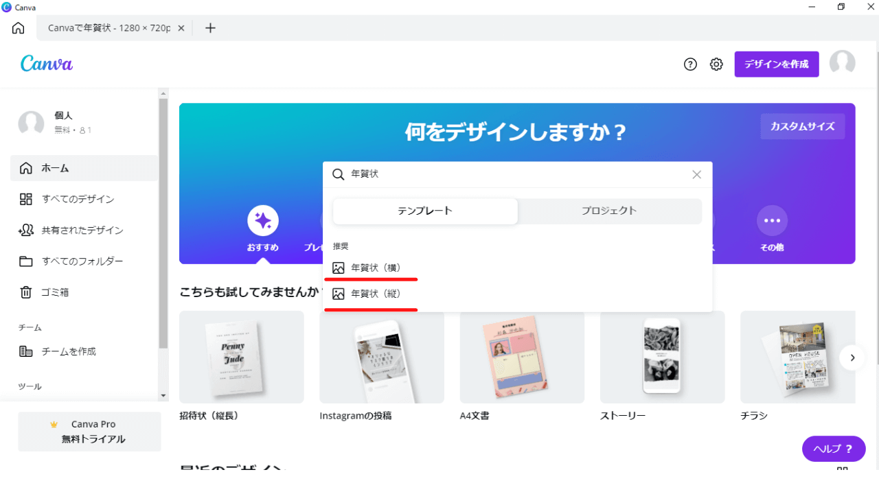 まずは、Canvaのテンプレートを使って年賀状デザインを作成します。わざわざ書店に行き、年賀状デザイン雑誌を買わずとも、豊富なデザインデータがありますので、お好みのデザインが見つかるはずです。